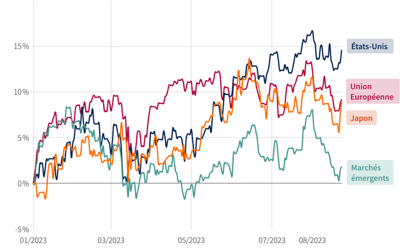 Les marchés actions ont été agréablement surpris par la résilience de l'économie et le recul de l'inflation. Ils sont en forte progression aux États-unis (S&P : + 14,5 %), en zone euro (Stoxx 600 : + 9 %) et au Japon (Topix : + 9 %). Il s'agit de chiffres arrêtés au 23 août 2023.